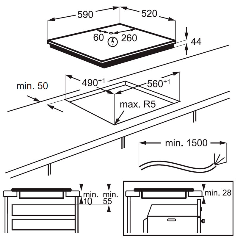 Dimensiones nicho de encastre: 55 x 560 x 490 mm (alto x ancho x fondo)
