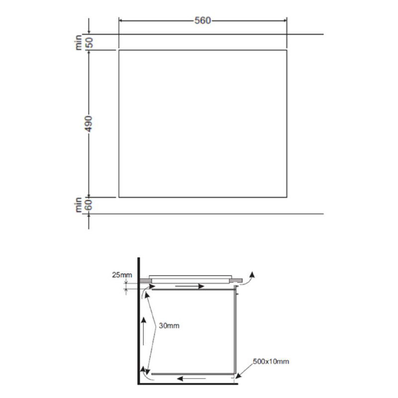 Medidas (alto x ancho x fondo): – Aparato: 62 x 592 x 522 mm. – Encastre: 28/40 x 560 x 490 mm