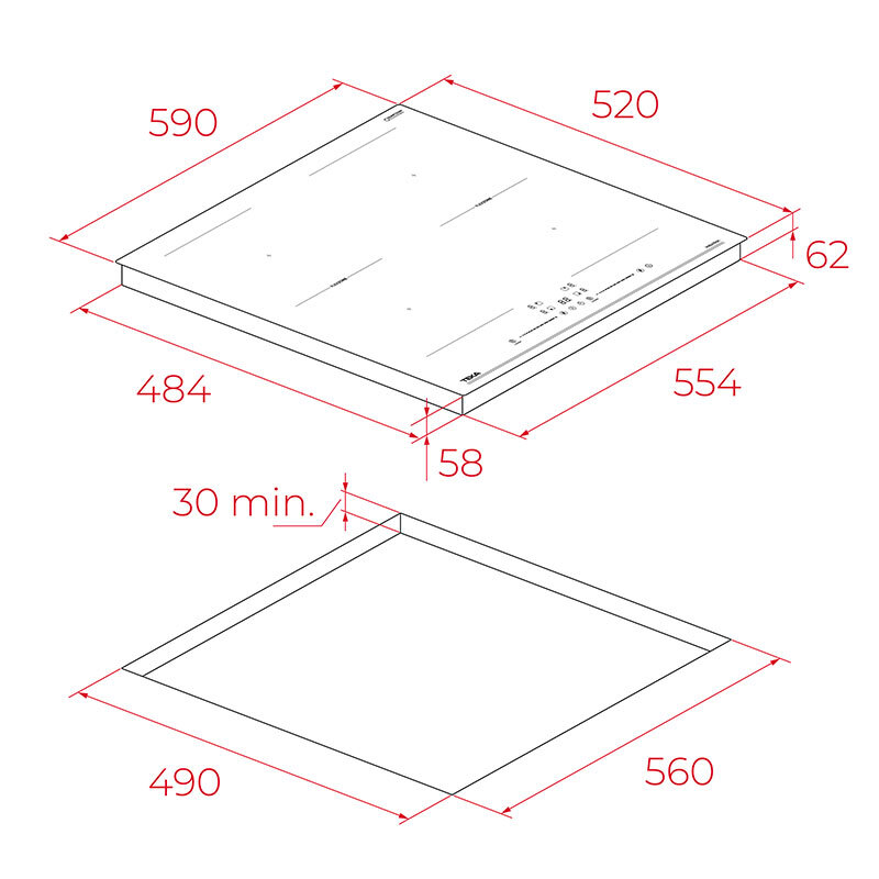 Dimensiones aparato: 590 x 520 x 62 mm (ancho x fondo x alto)